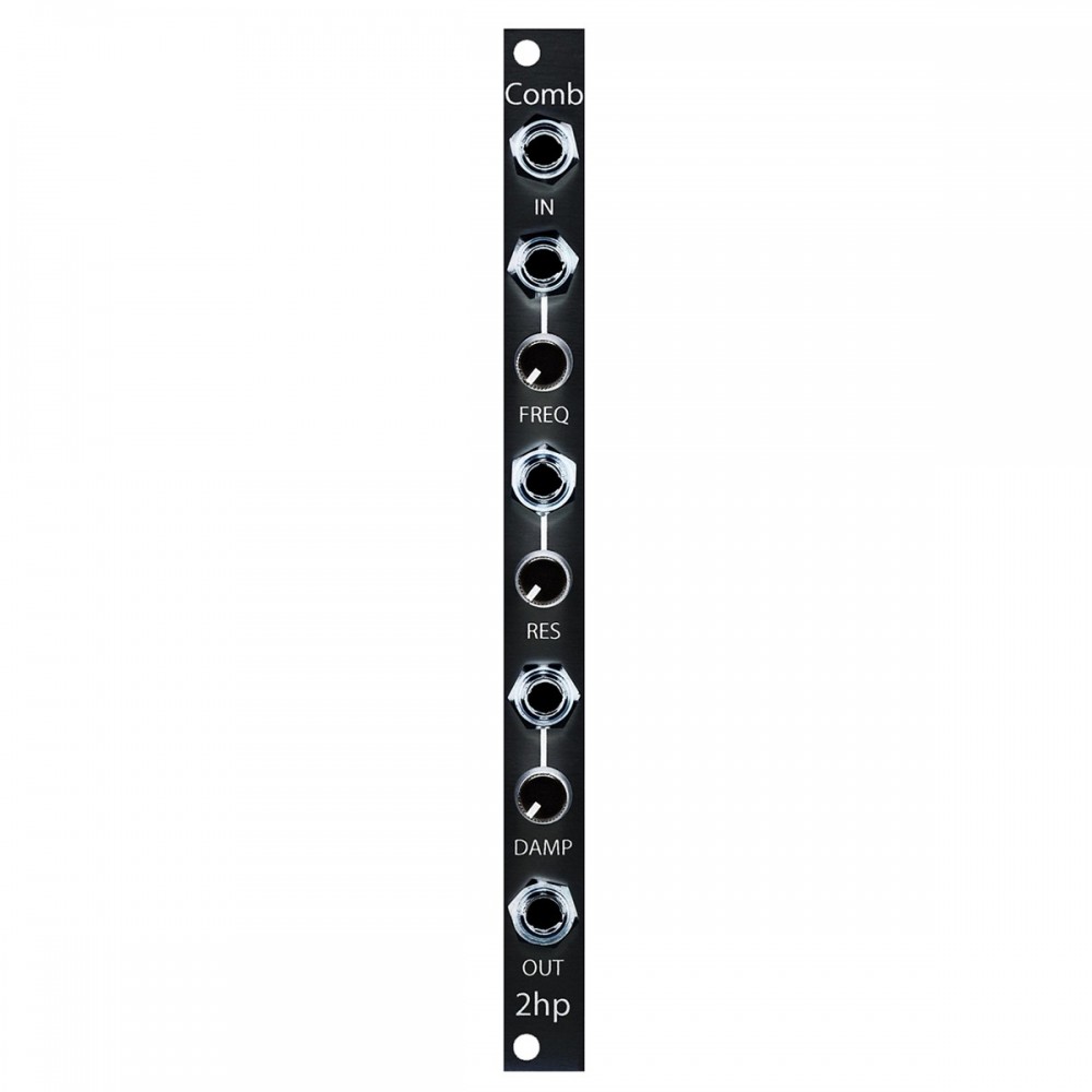 2hp Comb is an IIR peaking comb filter with control over cutoff frequency, resonance that can be driven into self oscillation, and a dampening filter in the feedback path.