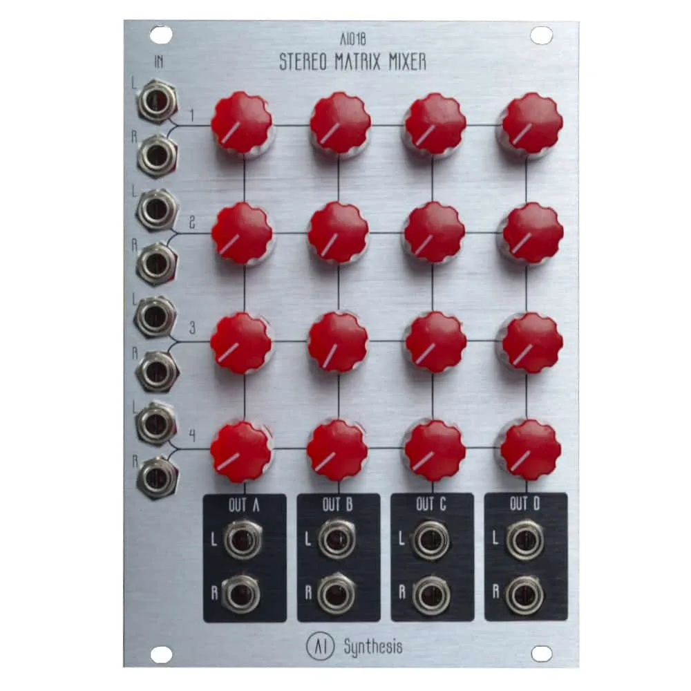 The AI018 Eurorack Stereo Matrix Mixer is a compact 8-in, 8-out matrix mixer. A matrix mixer is used to route audio or cv signals from multiple sources to different destinations. There are sixteen potentiometers, with each potentiometer controlling the amount a given stereo input pair (1-4) will be sent to a given stereo output (A-D).