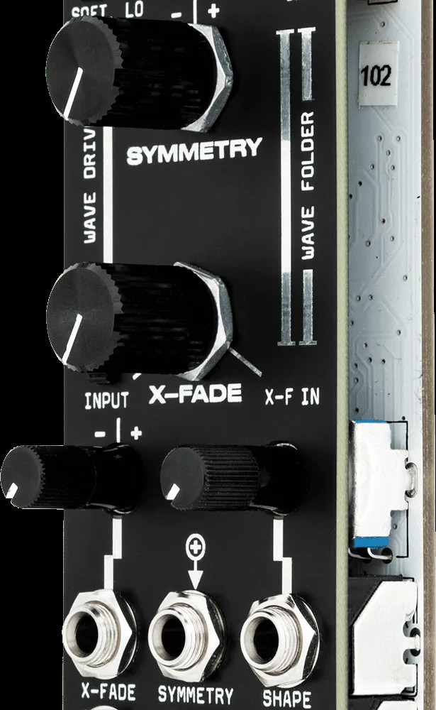 Both circuits share the same control voltages: the SHAPE which sets the input amplification before the wave shaping circuit and the SYMMETRY control which adds voltage offset to the input signal to provide various asymmetric overdrives or wave folding sounds. There is also voltage FBK CV jack which when provided with positive voltages feeds respective portion of the output signal back to the input which results in chaotic and aggressive behaviours. It is calibrated to work well with 5V gate voltages.