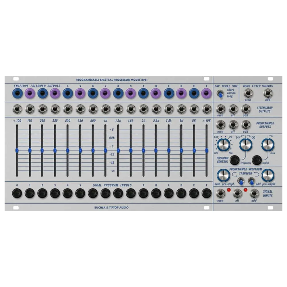 The Tiptop Audio Buchla 296t module is designed to replicate the complexity of Don Buchla’s Programmable Spectral Processor Model 296, which encompasses filtering, envelope following, vocoding, and more. It incorporates 16 fixed-frequency filters; these filters all use the same inputs, but understanding the other features requires closer examination of the output sections.