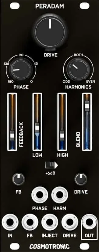 Peradam is an analog distortion module with an internal sidechain, like a compressor’s twisted brother. The input signal is split up in a main signal that goes into a VCA, and side-chain. The side-chain is first phase modulated, and then ring modulated by itself, to create a signal at twice the frequency of the original. This signal then modulates the amplitude of the VCA, creating complex self distortions in the main signal.