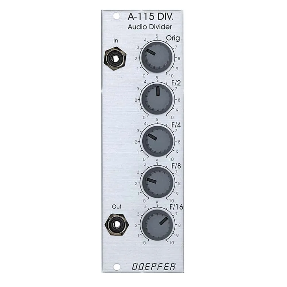 A-115 is a four-way frequency divider. The frequency of a signal at the input is halved (half frequency = first sub-octave), quartered (1/4 frequency = second sub-octave), and so on. In this way, the DIVIDER produces four sub-octaves (F/2 down to F/16).