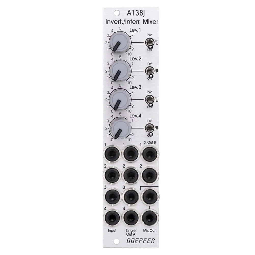 A-138J is a four channel mixer with an additional polarity/mute switch for each input. In the upper position of the corresponding switch the inverted signal is used. In the center position the input in question is turned off (mute) and in the lower position the “normal” (i.e. non-inverted) signal is used. The inverting of signals is used especially for control voltage signals (e.g. LFO, ADSR). But even for corellated audio signals this feature is useful. For example for feedback applications or the mixing of original and processed signals (e.g. original and filtered signal to obtain new filter types).
