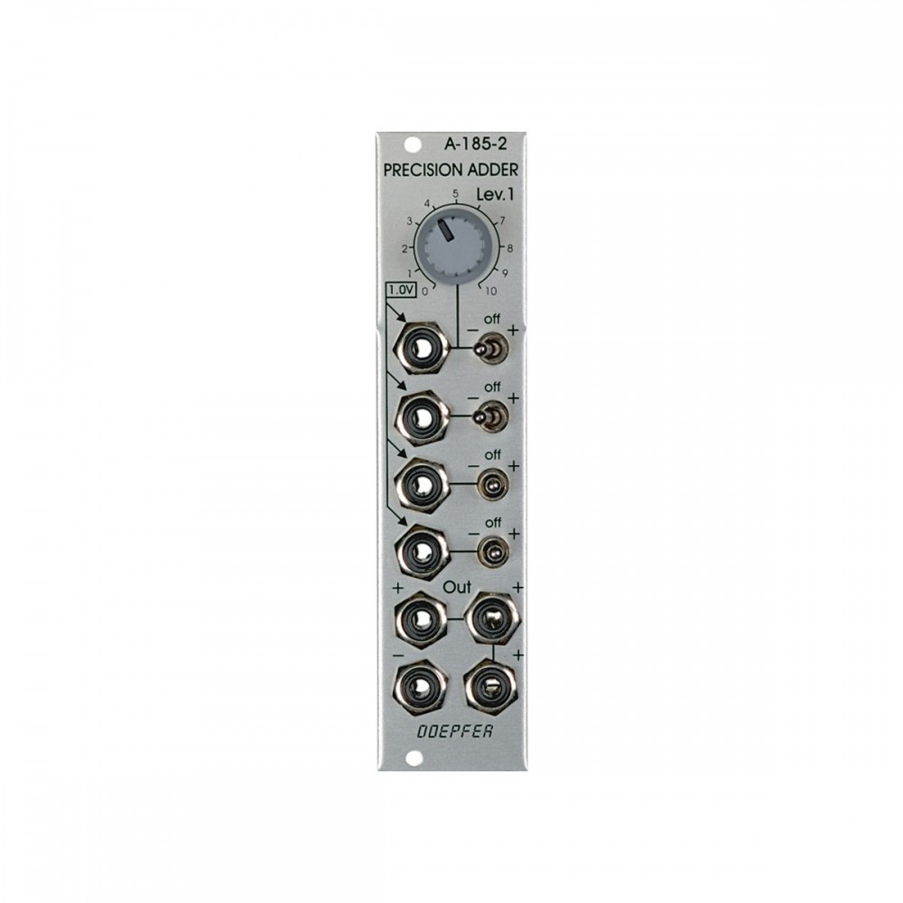 Module A-185-2 is a precision control voltage adder/buffer. Precision means that the amplification of the inputs without attenuators is exactly 1.00 and is suitable to add control voltages for the pitch control of VCOs (e.g. from keyboard + sequencer 1 + sequencer 2). Summing resistors matched to 0.1% are used to obtain an accuracy of 0.1% for the added voltages.