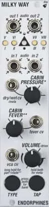 The Milky Way by Endorphin.es is a stereo effects module that provides a total of 16 different effects in the Airways and Darkwaves banks. The effects themselves can be controlled via control voltage, even the effect volume has its own input. Thanks to the tap button, programs can be adjusted to the desired tempo.