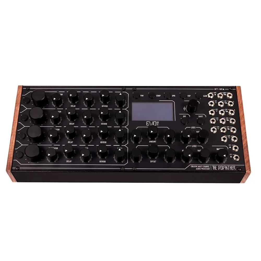 A serious FX machine for serious sound shaping, the Godfather allows you to process 4 separate audio channels, so you can mix, equalize, compress, saturate, filter, and add emphasizing effects in quad mono, stereo or quadraphonic. Multiple independent delays for each channel, capable of generating captivating grooves, surprising rhythmic junctions, and complex polyrhythms. Create additional sound layers by adding filtered repeats within the main repeats for each of the 4 channels