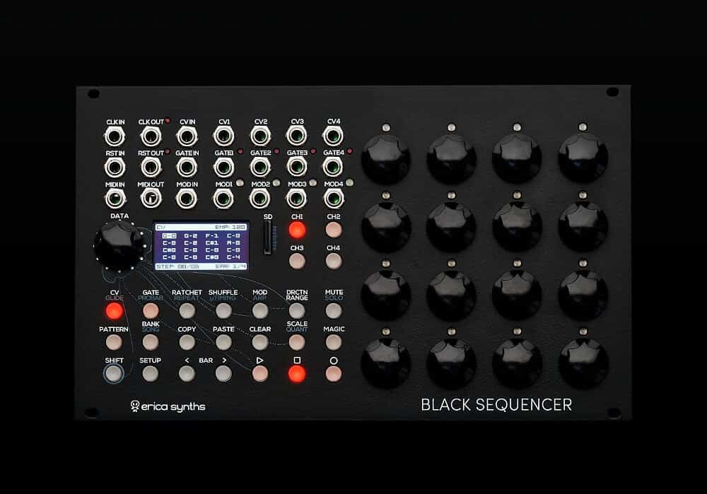 NB! The Black Sequencer is shipped with firmware V1.0! On firmware V1.0 the CV IN, GATE IN and MOD IN inputs are disabled and MIDI implementation is limited to clock functionality. Please follow information on Erica Synths website as new functionality will be added with future updates!