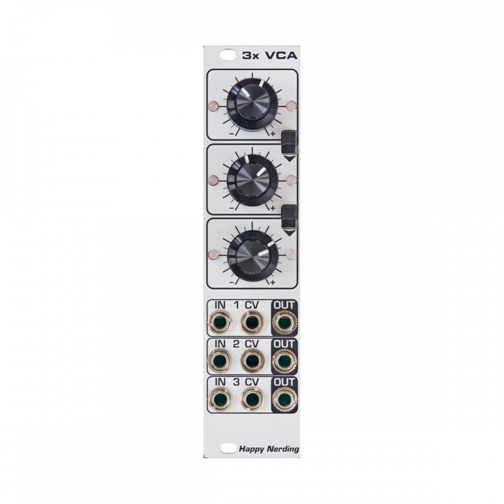 3xVCA of3xVCA_sitefers three high class amplifier circuits with linear characteristic. Thanks to AC / DC compatibility, a very low noise floor and basically no distortion, the module is not only a great partner for control voltages, but audio material as well. Besides a signal input and output, each VCA has its own CV input. The dual potentiometers regulate levels and bipolar CV attenuation values of all amplifiers. Using these rather unusual, yet very practical components, it was possible to equip the 3x VCA with a front panel that is only 6 HP wide. Switches allow the user to feed the results of one amplifier to the output of the next amplifier, so we can get 1+2, 2+3, and 1+2+3 outputs mix. Two-colored LEDs visualize CV and output signals.