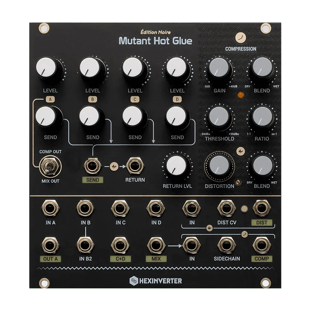 The Mutant Hot Glue is a versatile bus mixer for analog effects chain design. The included analog compressor offers series or parallel compression and a sidechain input, making it particularly well suited to drum processing. The voltage controlled distortion is based on ideas borrowed from the guitar pedals responsible for a lot of yesterday’s acid style techno sounds, but improved over the guitar equivalents, and made specifically for synthesizer and drum processing. The distortion can be used in its default position, normalized to the effects send, or like every other part of the module, broken out and used elsewhere in your modular system.