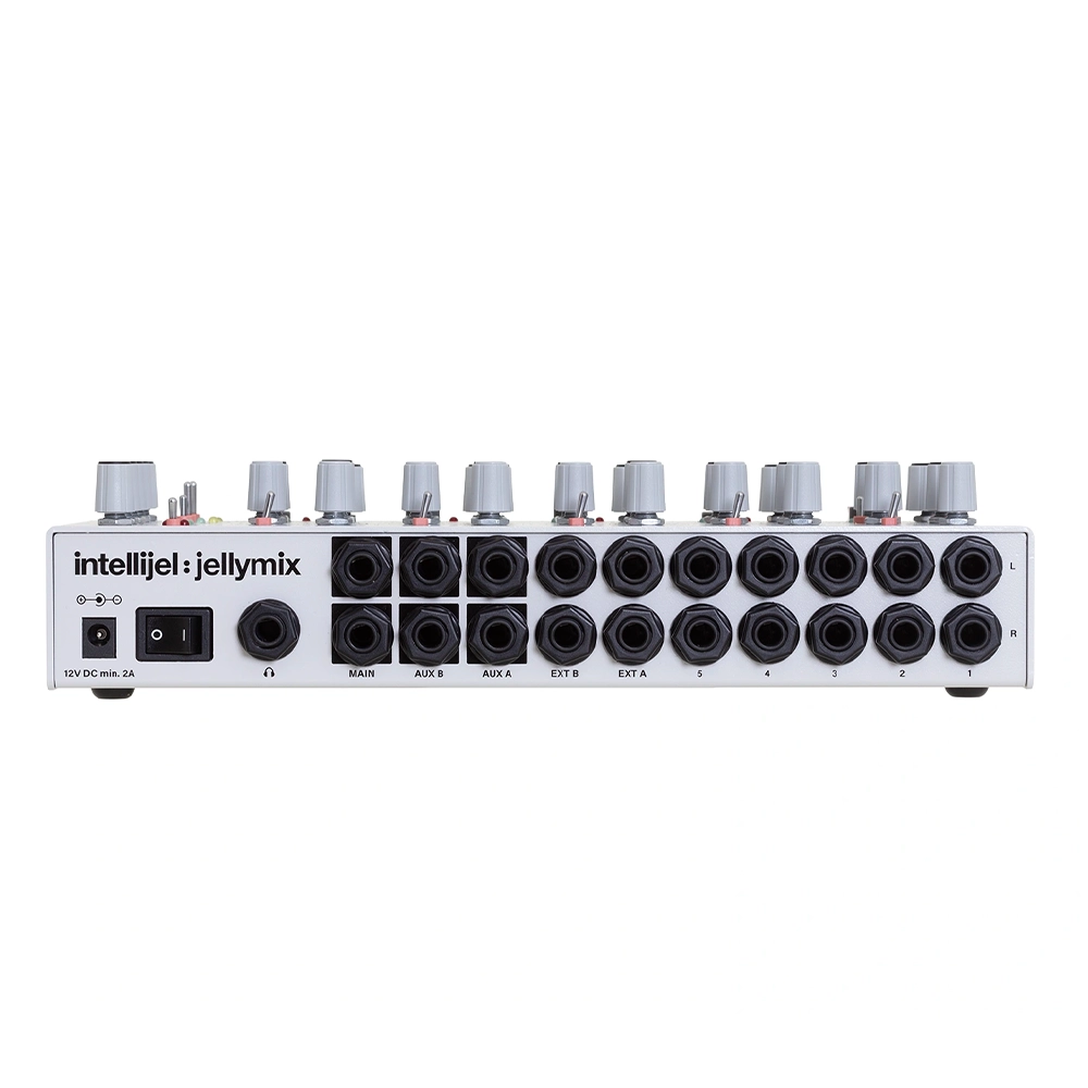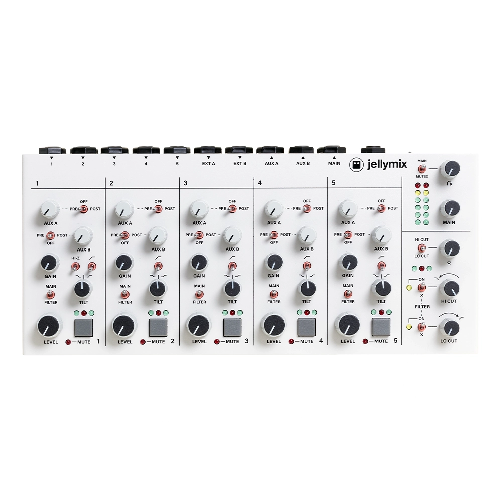 Jellymix is a compact stereo performance mixer designed for electronic musicians. Connect your favourite synths, drum machines, modules, and grooveboxes to the five stereo input channels. Shape your sounds live with channel EQ, the dual stereo resonant filters, and stereo effects on the two stereo AUX busses. The tactile and inviting interface of Jellymix is perfect for knob twiddling, switch flicking, and/or button pushing your way to new sonic joys and dubby dreams; live on stage, your living room, or in the studio.