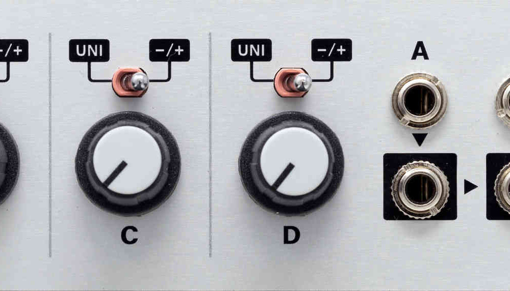 The four handy knobs can act as active attenuators (unipolar) or attenuverters (bipolar) depending on the setting of the two-position switches above each channel.