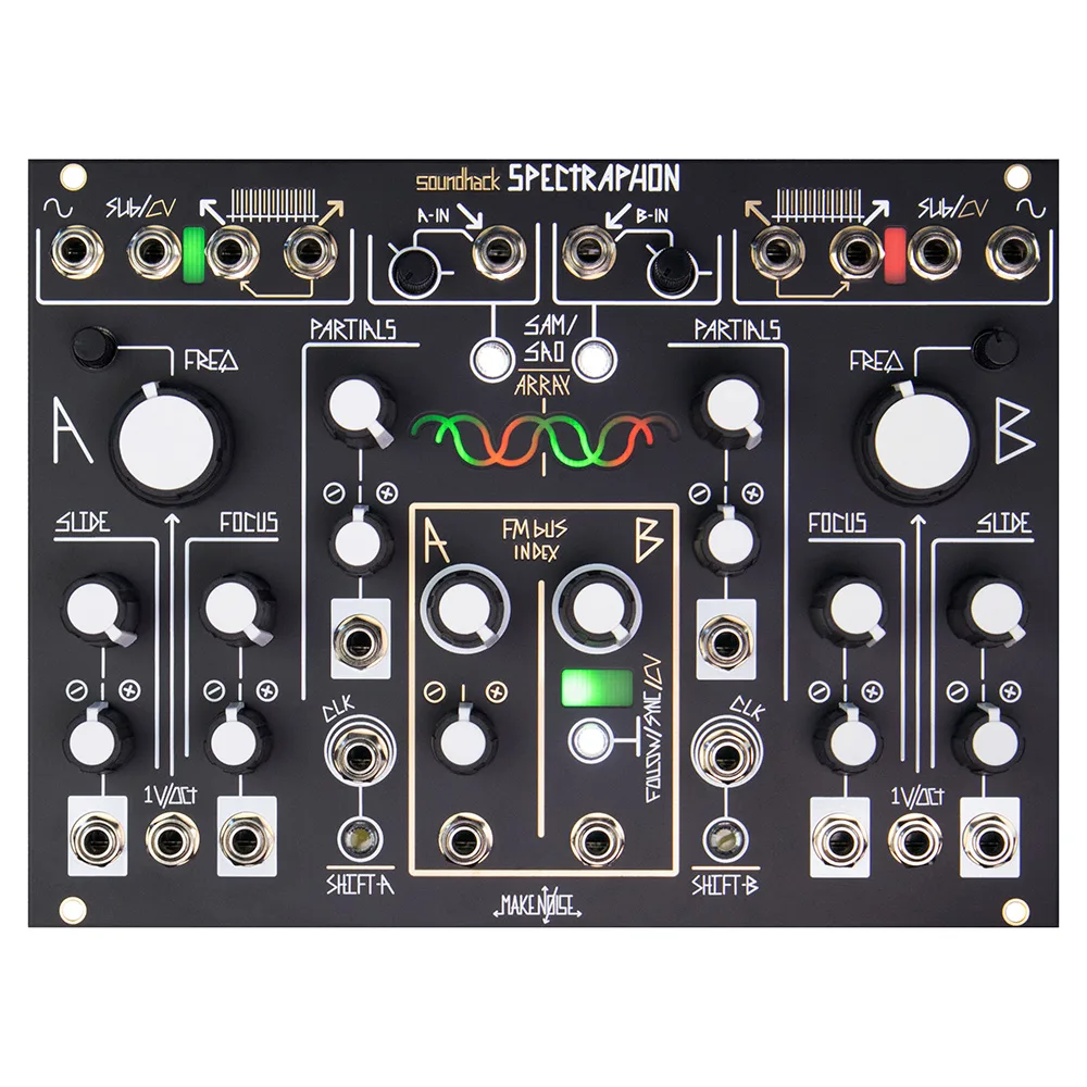 The Make Noise/soundhack Spectraphon is a dual Spectral Oscillator coded by Tom Erbe of soundhack. It uses real-time spectral analysis and resynthesis to create new sounds from those that already exist. It is inspired by classic electronic musical instruments of the past, including spectral processors, additive synthesis, vocoders, and resonators especially the Buchla 296 and Touché, but it takes a physical form more resembling the classic analog dual complex oscillator in the lineage of the Buchla 259 and the Make Noise DPO.