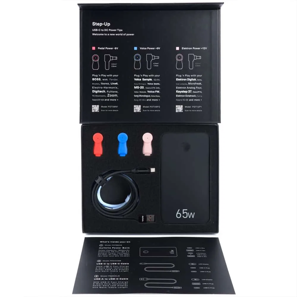 Included are 3 x Step-Up Power Tips, small tips that fit on the end of a USB-C cable, changing the output and tip size so you can power gear that uses voltages other than 5V from USB, up to 100 Watts, adding freedom and flexibility to your setups, letting you play wherever you are.