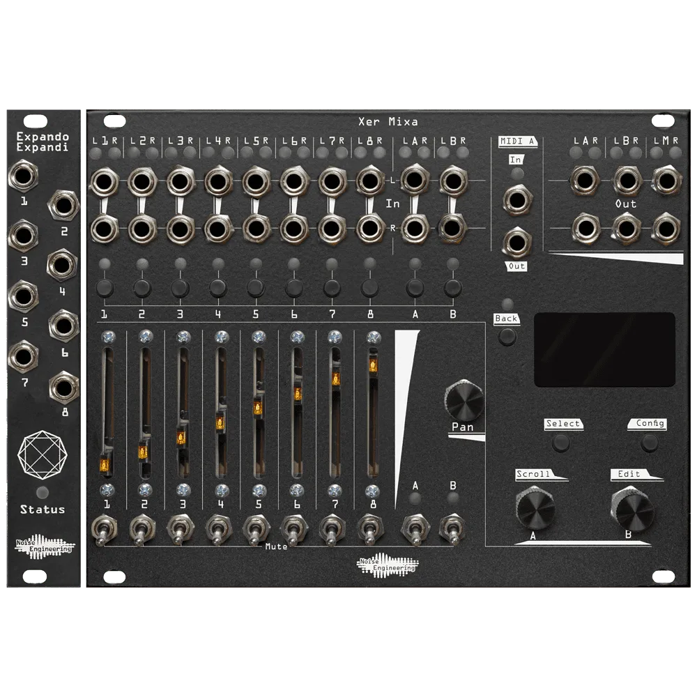 Xer Mixa is a compact 32HP, with a streamlined and easy-to-use interface. CV control over almost any parameter is available through the rear-panel connecting Expando Expandi, which adds CV 8 inputs to Xer Mixa. Connect up to two Expando Expandis for easy CV control over channel levels, pan, aux sends, and more. Xer Mixa and Expando Expandi are available together as a discounted bundle, or individually.
