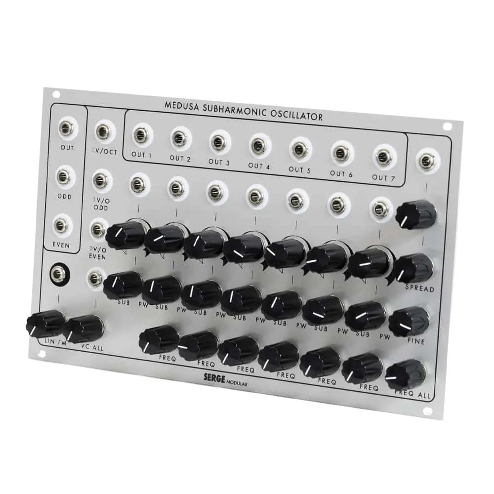 The Subharmonic Oscillator is one of Serge’s latest inventions and also one of his most extraordinary designs. 7 accurate analog VCOs tied at the waist—in unison, yet their frequencies can open up like a fan, creating complex clusters. Each voice generates a pulse wave. It is temperature compensated and follows exceptional 1V/Octave tracking.