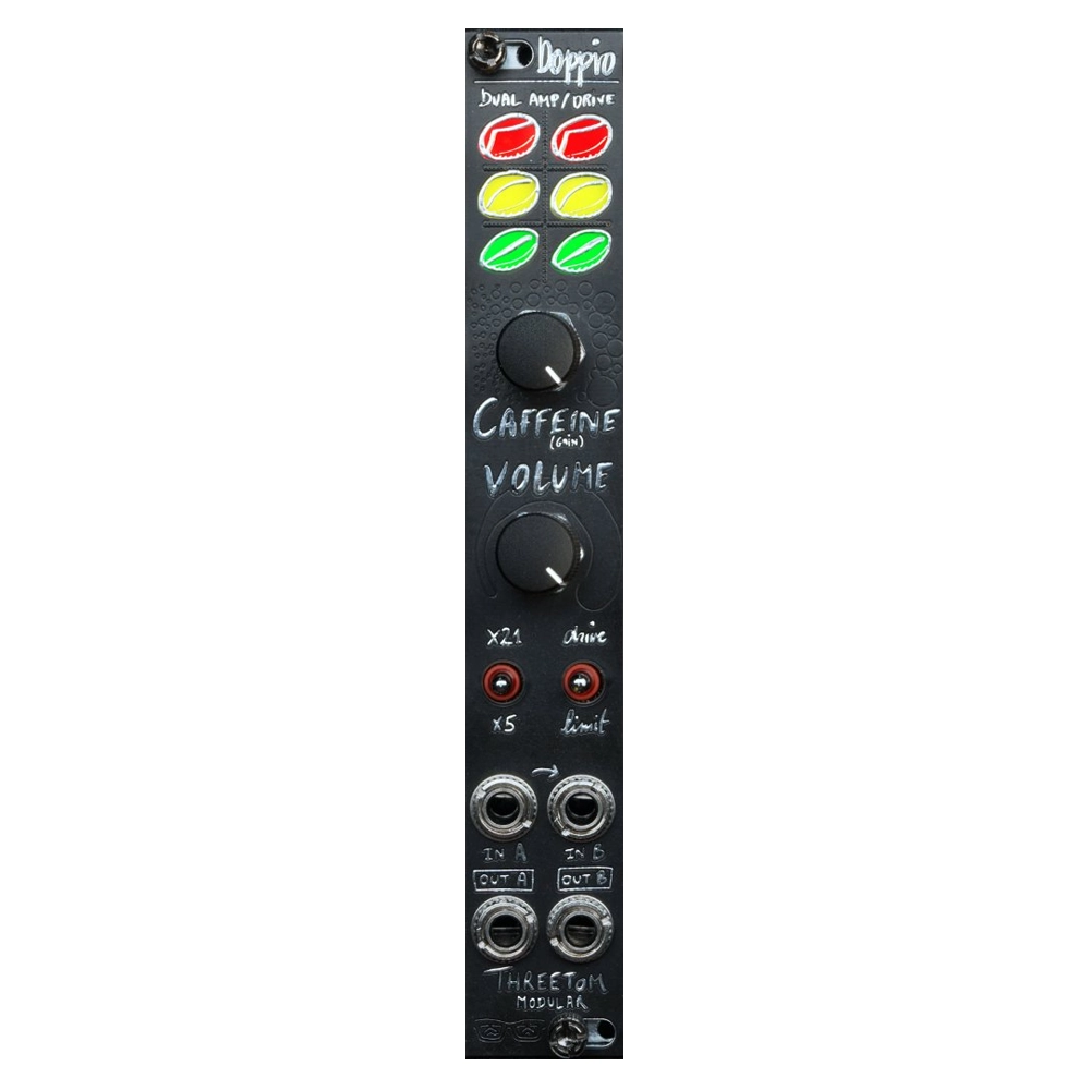 The Threetom Modular Doppio is a compact stereo amplifier, drive, and soft limiter module. Doppio helps complex and dynamic stereo sounds to find their place in a modular synthesizer context, where signals are hot, and headroom is extremely limited. Doppio does this by implementing a compact, yet flexible, soft-knee limiter. The limiter is specifically designed for eurorack levels and avoids the need for unnecessary make-up gain, resulting in a lower noise floor.